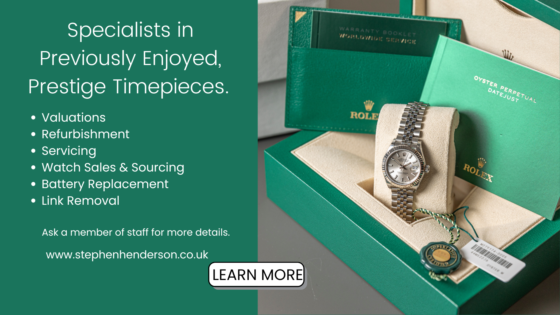 Stephen Henderson the Jeweller specialises in hand-selected jewellery, pre-owned prestigious brand watches, previously enjoyed jewellery and superior customer service. With a wide selection of diamond jewellery, gold and silver, wedding bands, previously enjoyed jewellery and luxury pre-owned watches, we are sure to have something special at the right price for you.